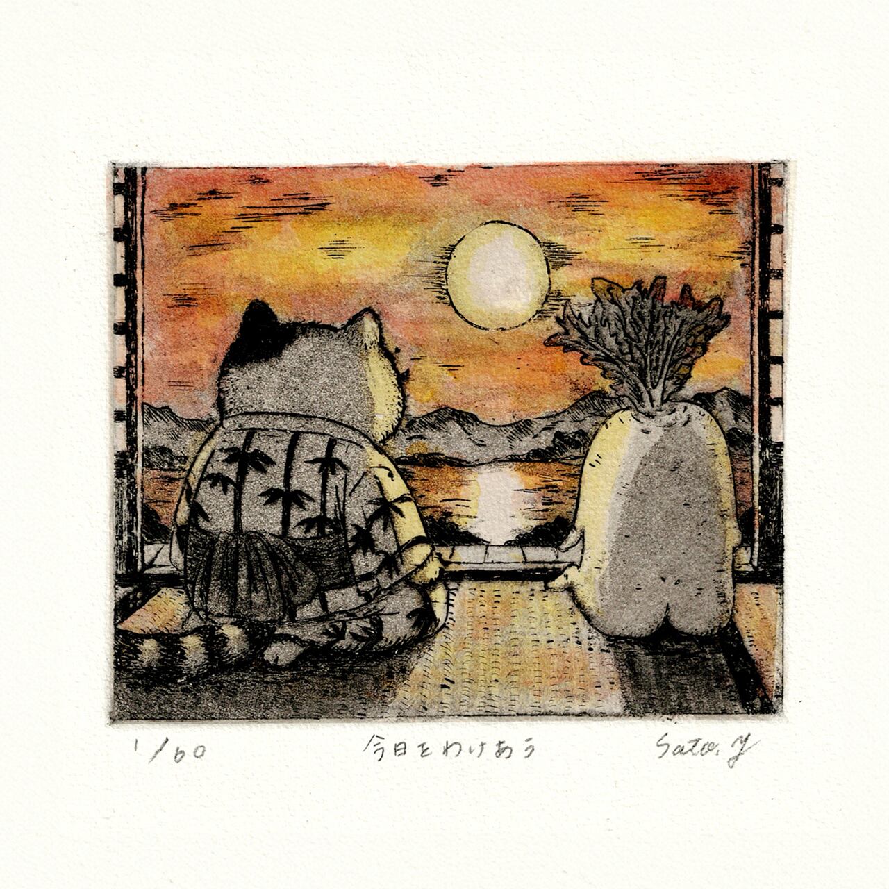 夕焼けをみるだいこんとねこ。今日をわけあっているのでしょうか。